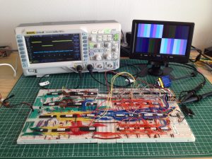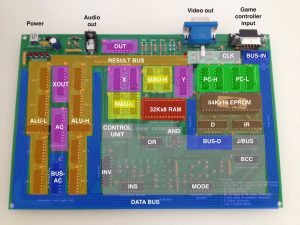 Unsatisfied, we set out to find a better architecture. You may call it feature creep. This study evolved into our own architecture, with the ALU dividing the data bus into two segments, for increased throughput and reduced component count. Somewhere along that journey we discovered that low resolution video had come within reach of our design, without adding chips. This was possible by taking the unconventional step of bit-banging video signals from software, instead of designing a standard video generation circuit. That was the point from where we couldn’t go back anymore: this concept just had to be taken to full completion, including a software stack that demonstrates it all.