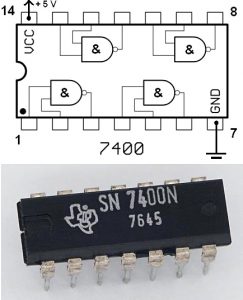 Transistor-transistor logic (TTL) is a way of building logic gates on ICs, originally by using bipolar junction transistors for both switching (the first “T”) and for output buffering (the second “T”). This method was popularised by the Texas Instruments 7400-series that were introduced in the 1960s. These types of chips are among the first generations of ICs, before the invention of the microprocessor (and before both of us were born). The 7400-family has all kinds of chips with individual NAND/NOR/AND/OR/XOR gates, inverters, buffers and chips with common blocks such as adders, shifters, multiplexers, decoders and flip-flops. They could be combined to build more complex systems, much like LEGO bricks. Later branches of the family use MOSFETs instead of bipolar transistors, but the principles stayed the same and the part numbering became standardised.
