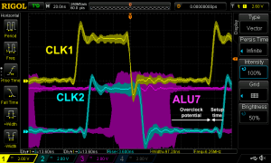 Yes, just replace the crystal with a faster one. The design was made using 70 ns RAM chips and a 160 ns overall cycle time, or 6.25 MHz. For the kit version we included 55 ns RAM chips as they are easier to get in quantity. This means that you can probably push the cycle time to below 150 ns and reach 7-8 MHz out of the box. By using faster RAM and 74F series can go well over 10 MHz, with 12.5 MHz already demonstrated. The board is prepared for overclocking experiments. The RAM is in a socket for easy replacement. The clock signal that goes to the registers is phase-shifted by a few nanoseconds. With the 55 ns RAM this is not really needed, but when you go near the limits these nanoseconds help a lot. There are breakouts on the board for ALU7 and for the clock, to which you can hook up an oscilloscope and check how much leeway there is. (ALU7 is the slowest signal in the design.)