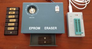 Sure, there are two ways. The hardcore way is by writing native 8-bit Gigatron machine code. This means reprogramming the EPROM, because this is a Harvard architecture. Programming this way you can let the Gigatron do whatever you want. You will need an EPROM eraser and chip programmer, but you can get them cheaply from the usual Chinese vendors. We use the ubiquitous MiniPRO TL866 for programming that costs around 30 euros, and a nameless eraser that costs around 15 euros. In reality you will do all testing in an emulator first, so the cycle time isn’t a real issue. There are no simple EEPROM replacements (1Mbit 64k x 16bit) as far as we are aware.