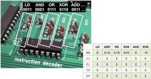 The first stage is flexible: it is not restricted to the common AND, OR, XOR etcetera. It is controlled by a truth table that comes out of the control unit. The truth tables for the different operations are wired in a diode matrix. If you know where to look, you can see the operations! A diode represents a “1”, the absence of a diode represents a “0”.