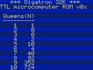 To test, I ported my old n-Queens solver. It exercises bitwise logic and recursion, so it is a good test for these new instructions. On the screenshot above you can see it gets the correct answers for the sequence. The solver uses 5 stack variables. That, plus one for the the return address, gives 12 bytes per invocation. With the stack living in the top half of the zero page, this means we can go 10 levels deep. The solver needs less than a minute to compute the list, or at about 850 recursions per second. [Edit: I just figured that it should be easy to go down to using 4 variables or 10 bytes, and with that up to 12 levels deep.]