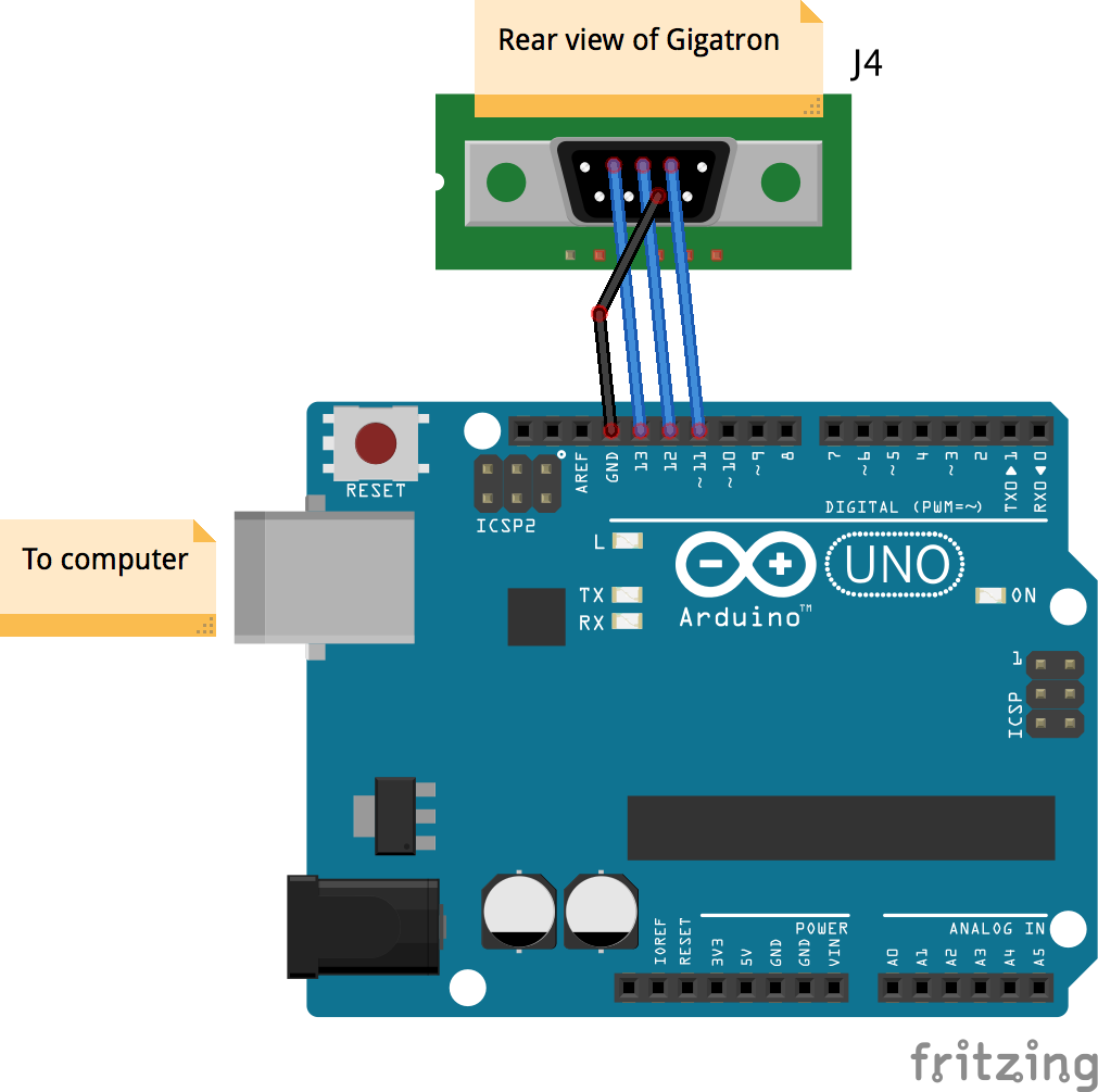 Although 8-bit assembly programs must be programmed in the EPROM, interpreted programs run from RAM. The built-in applications are of course stored in ROM also, but they are loaded into RAM first, so they use the ROM merely as a disk. Interpreted programs can also be loaded into RAM directly over the input port, and this is how you can program the Gigatron without using an EPROM eraser and programmer. For this I hook up the input port pins, that normally go to the game controller, to a simple Arduino. The Arduino can send data at the same rate as the horizontal sync. With some checksumming overhead, this boils down to exactly 28k8 payload bits per second. Much faster than loading C64 programs from tape back in the day… (3000 baud with speed loaders!)
