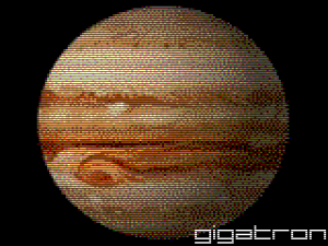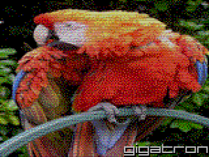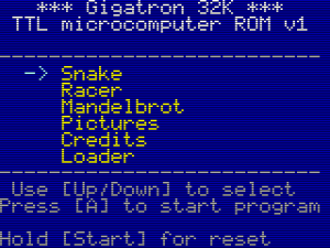 This converts the Gigatron into a picture frame. ROM v1 comes with three classic colorful high-resolution images built in. Every 15 seconds the next image is shown. Hold down a button if you want to look at the current image for a bit longer.