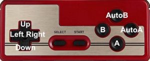The standard Gigatron controller is a Famicom-like game controller. The left side is for selecting a direction. [A] and [B] are on the right hand side as shown in the picture. Both have an “Auto repeat” button next to them.