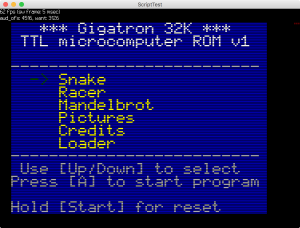 Martin kindly made a nice visualizer for the Gigatron. It is a bit rough, but cool and useful. It is realtime and also does the sound and blinkenlights. It works on Linux, Mac and Windows. You will need to study the included README file to know what buttons to push and where to place ROM files.