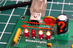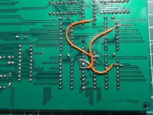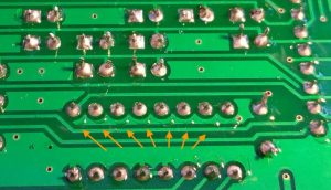 If you find out you’ve misplaced a component, you need to desolder it. Be careful not to use excessive force and don’t overheat! Desoldering requires a lot of patience and restraint. We find it safest to cut loose the offending component, and then desolder the individual pins one by one. It’s better to sacrifice the part than to damage traces in the board. We’re happy to send you a new part if you need one. When cutting, try to leave a long pin on the board for easier handling when desoldering. Ground pins can be more difficult to remove. Remember not to rush it or use too much force and heat, otherwise traces will break. Don’t despair if it takes you half an hour or more to desolder one part. But if you know somebody with a desoldering gun, then it’s just a 5 minute job.