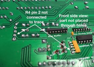 If the “Power OK” LED is lit and stable, double-check that all components are placed in the correct orientation: the ICs, resistor arrays, LEDs/diodes and electrolytic capacitor have a polarity that matters. Start by checking the ICs and diodes. Don’t forget to check the orientation of the resistor arrays: R4, R5 and R8.
